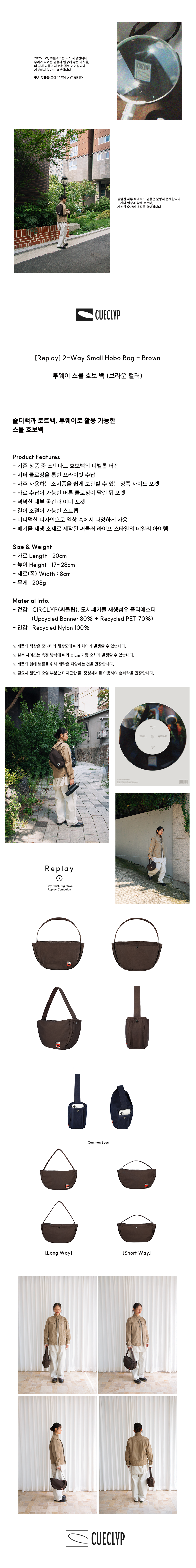 Product Features - 기존 상품 중 스탠다드 호보백의 디벨롭 버전 - 지퍼 클로징을 통한 프라이빗 수납 - 자주 사용하는 소지품을 쉽게 보관할 수 있는 양쪽 사이드 포켓 - 바로 수납이 가능한 버튼 클로징이 달린 뒤 포켓 - 넉넉한 내부 공간과 이너 포켓 - 길이 조절이 가능한 스트랩 - 미니멀한 디자인으로 일상 속에서 다양하게 사용 - 친환경 소재로 제작된 써큘러 라이프 스타일의 데일리 아이템 제안