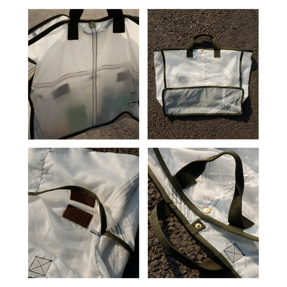 Material upcycled PARACHUTE 수명이 다해 폐기된 군용 예비 낙하산 원단입니다. 원단의 무게는 가볍고 경도가 강하며 질긴 편입니다. 부드러운 질감의 반투명한 오프 화이트 색상이며 은은하게 광이 있습니다. 낙하산은 나일론 소재로 제작되었으며 물에 젖습니다. 특유의 빈티지한 이음새와 스티치가 인상적인 원단입니다. 낙하산 원단은 세탁 과정을 거친 후 제작되었습니다.