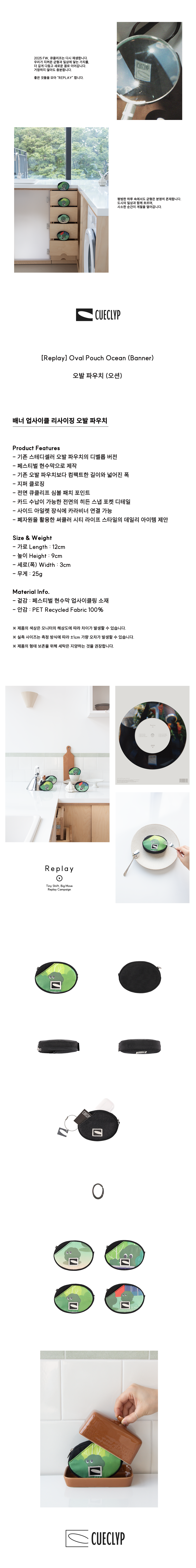 Product Features - 기존 스테디셀러 오발 파우치의 디벨롭 버전 - 페스티벌 현수막으로 제작 - 기존 오발 파우치보다 컴팩트한 길이와 넓어진 폭 - 지퍼 클로징 - 전면 큐클리프 심볼 패치 포인트 - 카드 수납이 가능한 전면의 히든 스냅 포켓 디테일 - 사이드 아일렛 장식에 카라비너 연결 가능 - 폐자원을 활용한 써큘러 시티 라이프 스타일의 데일리 아이템 제안